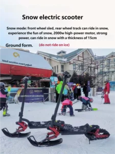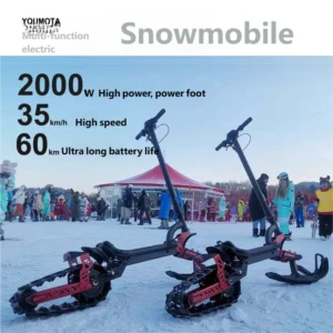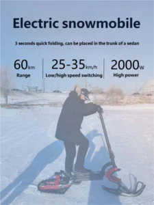 Electric 3-in-1 Snow Vehicle (Snow Track Scooter/Sled/Snowmobile/Snow Car) featuring a powerful 2000W motor and a maximum speed of 45 km/h. It offers long range for maximum winter fun and skiing enjoyment. Equipped with built-in LED lighting, NFC unlock, and proximity sensor automatic unlocking. Front and rear spring suspension allows it to easily handle complex terrain.