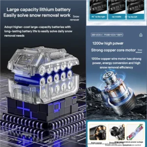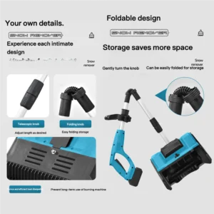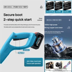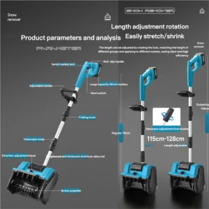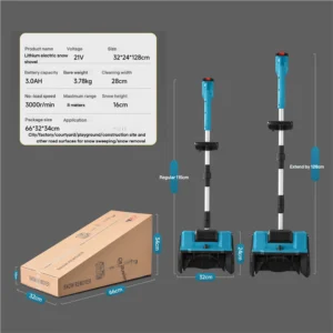 Handheld Electric Cordless Lithium-Ion Snow Blower for roads, schools, and home use. It is compact and flexible, ideal for domestic use, powered by a 21V lithium battery. It has a snow throwing distance of 6 meters, a clearing width of 30 cm, and a clearing depth of 17.6 cm. The unit comes equipped with 2 lithium batteries and 1 charger.